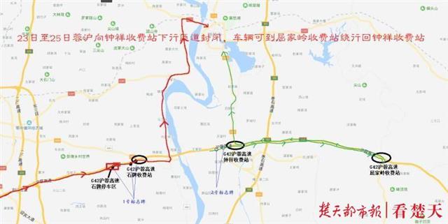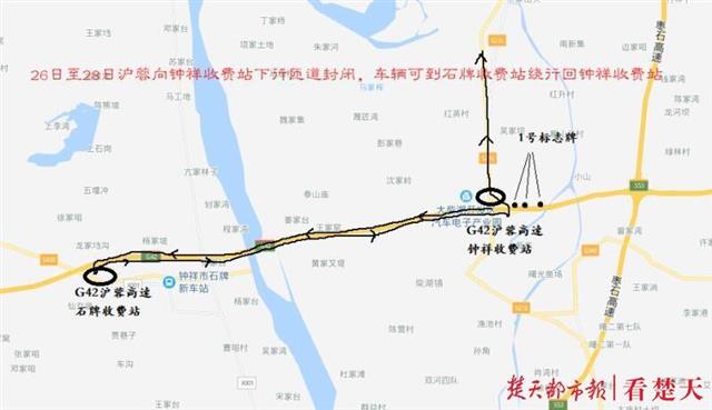 楚天都市报11月24日讯(记者潘锡珩 通讯员吴克思)因G42沪蓉高速钟祥收费站匝道养护施工需要,11月23日06时--11月30日18时(特殊天气顺延)对钟祥收费站匝道进行封闭施工。23日至25日蓉沪向钟祥收费站下行匝道封闭,车辆可到屈家岭收费站绕行回钟祥收费站;26日至28日沪蓉向钟祥收费站下行匝道封闭,车辆可到石牌收费站绕行回钟祥收费站;29日至30日钟祥收费站入口武汉方向上行匝道封闭,车辆可往荆门方向行驶到石牌收费站绕行往武汉方向。