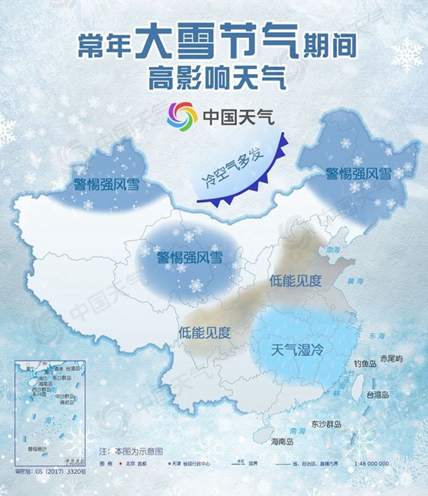 今年大雪节气期间,预计影响我国的冷空气势力可能会偏弱,中东部大部地区逐步回暖,气温可能比常年同期偏高1-3℃;冷空气活动减弱,雾和霾天气可能又将活跃,提醒公众注意空气质量变化,尤其是孩子和老人,在出现空气污染的时候出行一定要采取防护措施。降水方面,预计西南地区东部阴雨雪可能会比较频繁,比常年同期略偏多。