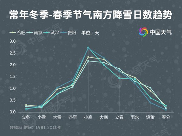 南方小伙伴们常会提起要去北方看雪,但其实去哪儿看雪还得分时候。从整个降雪季来看,大雪节气通常只是拉开序幕,后面的雪会越来越多。在北京、天津、石家庄和济南这些北方城市,降雪分布比较平均,波动较小。小寒和立春是两个降雪日数最多的节气。再看南方,合肥、南京、贵阳、武汉这些常年在大雪节气迎来初雪的城市,无一例外都是在小寒节气期间降雪日数最多,占全年的20%以上,大寒次之。且这些南方城市小寒和大寒的降雪总日数甚至全面反超华北、黄淮一带的省会级城市。