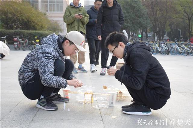 楚天都市报12月8日讯(见习记者李碗容 通讯员谢小琴 视频剪辑实习生钱丹)“哇,这也太厉害了。”“好惨啊,装置落地成渣了”昨日,武汉理工大学鉴湖教学楼上演着一场高空护蛋大赛。来自全校的580多个护蛋装置齐聚该校鉴湖教学楼4号楼,比赛谁能保障鸡蛋从17楼安全降落。最终共有36个参赛队伍完美完成这一任务。比赛碎了的鸡蛋,在该校食堂制作成了鸡蛋羹免费供应给学生。