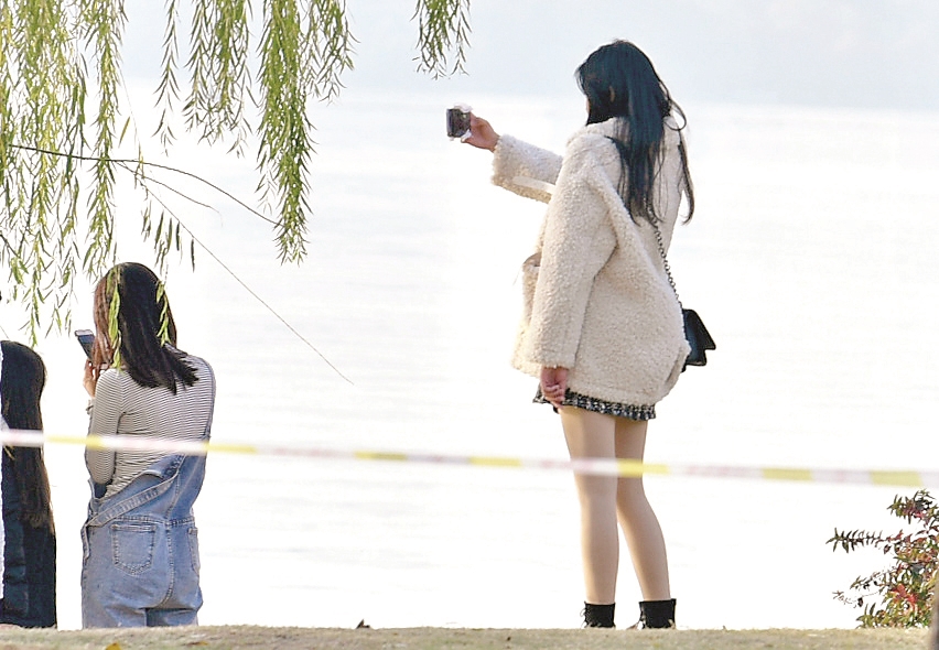 13日在东湖边,温暖阳光下,不少人还穿着春天的衣服