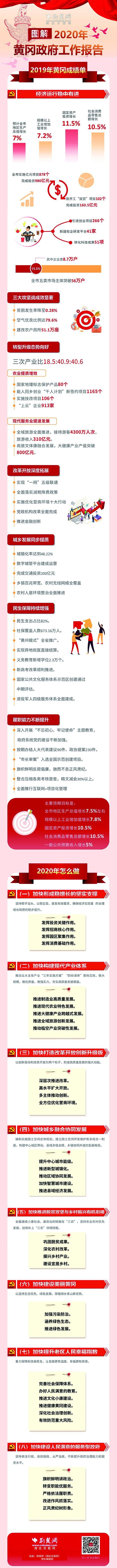 荆楚网客户端—荆楚网消息(记者 吕鉴蕾 通讯员 汪海燕)1月4日,黄冈市五届人大五次会议开幕,黄冈市委副书记、市长邱丽新作《政府工作报告》。2020年黄冈有哪些工作安排,经济社会发展的预期目标如何?荆楚网(湖北日报网)带你一图读懂。