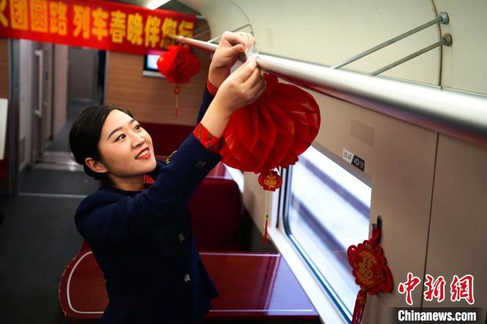 工作人员提前在车厢里悬挂灯笼。 张威 摄