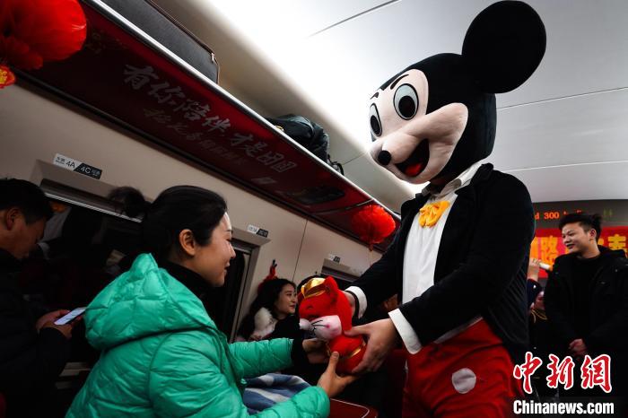 由工作人员扮演的米老鼠为旅客送上礼物。 张威 摄