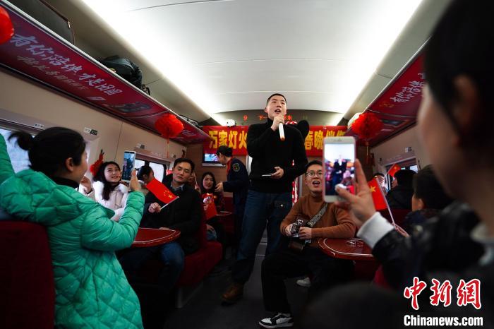 文艺小分队在高铁上演唱歌曲。 张威 摄