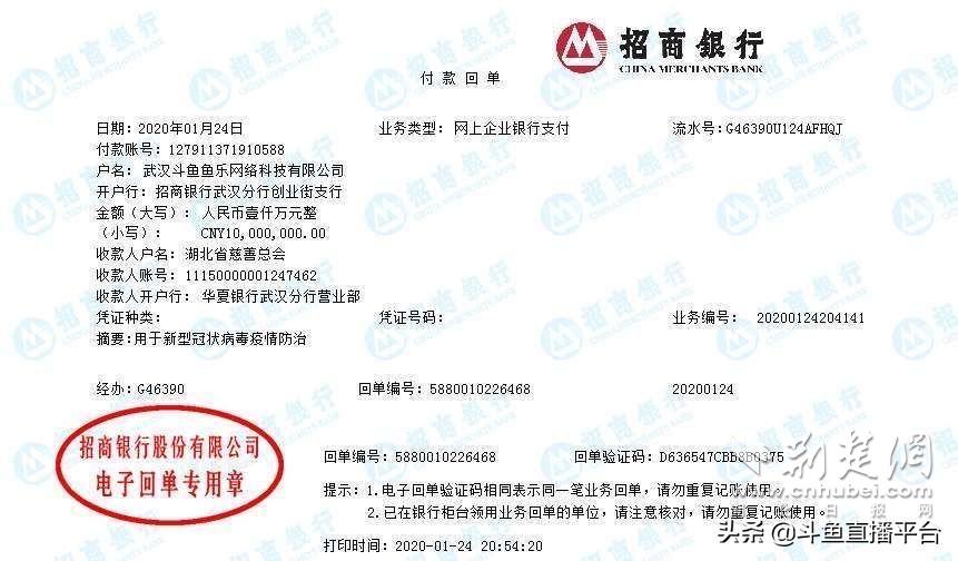 荆楚网客户端-荆楚网消息(记者 郑一鸣)1月24日,斗鱼向湖北省慈善总会捐款1000万元人民币,专门用于新型肺炎疫情的防治。