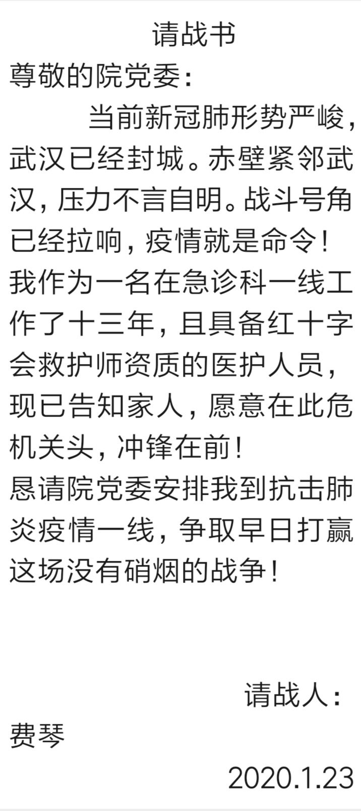 “我作为一名在急诊科一线工作了十三年,且具备红十字会救护师资质的医护人员,现已告知家人,愿意在此危机关头,冲锋在前。”这是来自市人民医院急诊科医护人员费琴的请战书内容,让人泪目。