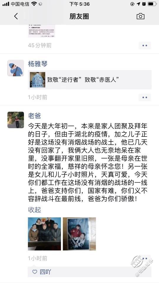 “国家有难,你们义不容辞战斗在最前线,爸爸为你们骄傲,爸爸支持你们。”这是市人民医院呼吸内科住院医师姚威的爸爸发的朋友圈内容。这位爸爸也和大家一样,既担心儿子的安危,却也为儿子感到骄傲和自豪。