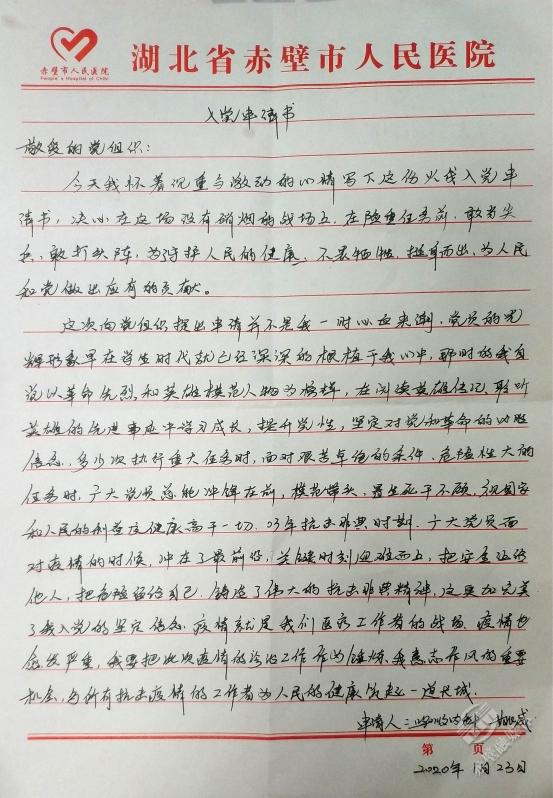 “今天我怀着无比激动的心情写下这份入党申请书,决心在这场没有硝烟的战场上,不畏牺牲,挺身而出。”这是来自市人民医院90后呼吸内科住院医师姚威的入党申请书。