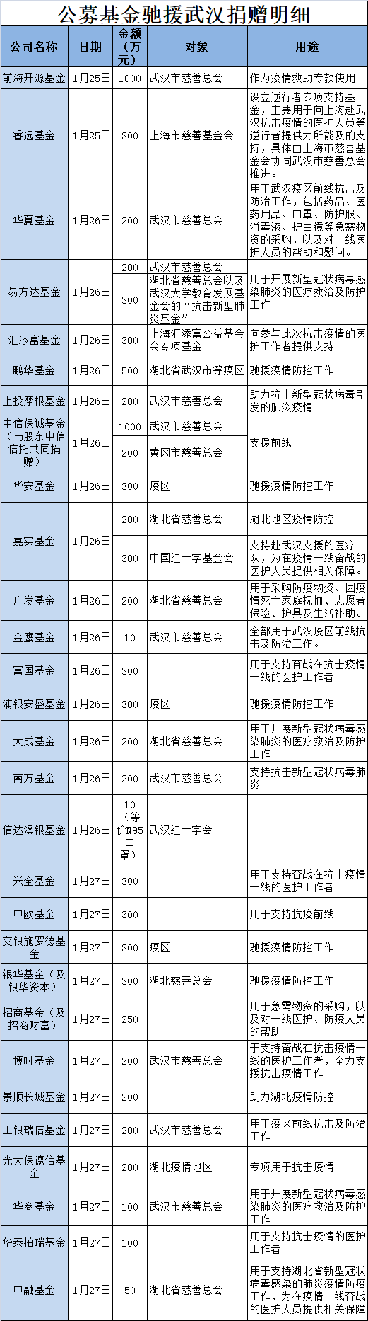 公募基金驰援武汉捐赠明细