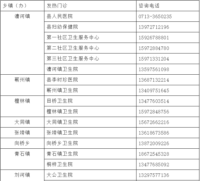 通告明确,蕲春县定点医疗机构为蕲春县人民医院、蕲春县妇幼保健院、蕲春县李时珍医院、蕲春县大同镇卫生院等28家机构则为发热门诊,覆盖蕲春下辖的13镇1乡1办事处。同时,群众还可通过预留的电话随时咨询。