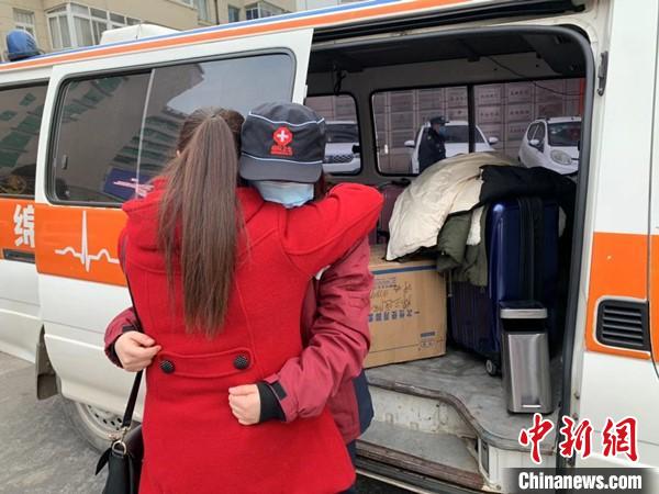 援助武汉的医务工作人员与家人相拥。 钟欣 摄