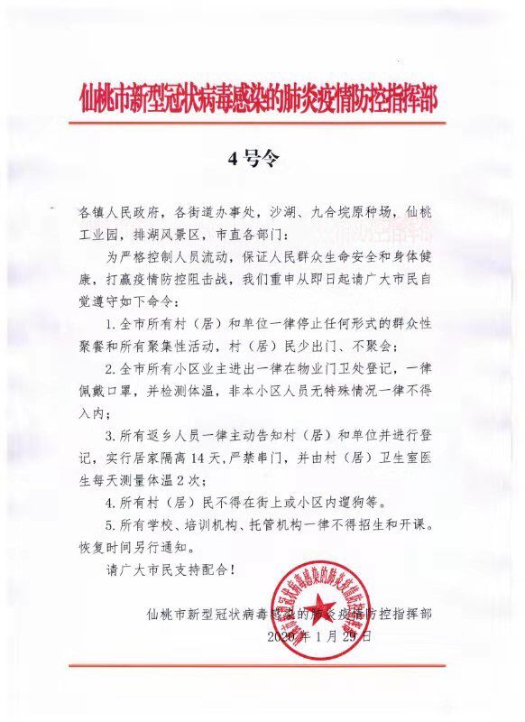 为严格控制人员流动,保证人民群众生命安全和身体健康,打赢疫情防控阻击战,我们重申从即日起请广大市民自觉遵守如下命令: