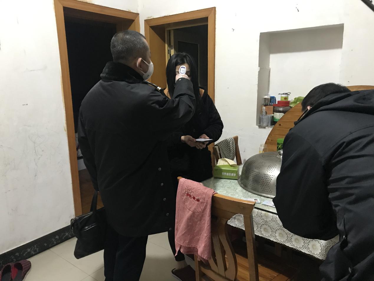 “吱呀”一声,穿着睡衣的张女士打开了门,门口站着两位戴着口罩,穿着制服,挂着工作牌的法院干警。“请问您家里有没有武汉返乡人员呢?我们来了解情况,也顺便给您和家人量量体温。”