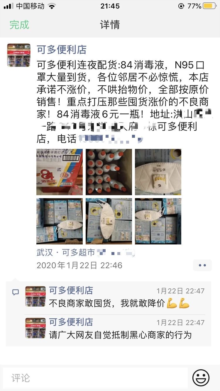 武汉封城之后,他迅速找到进货渠道,往店里进了一批84消毒液、免洗洗手液和75%酒精,旋即售空。