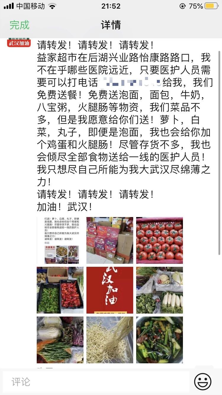 萝卜、白菜、丸子,即便是泡面,我也会给你加个鸡蛋和火腿肠!尽管存货不多,我也会倾尽全部食物送给一线的医护人员!……”