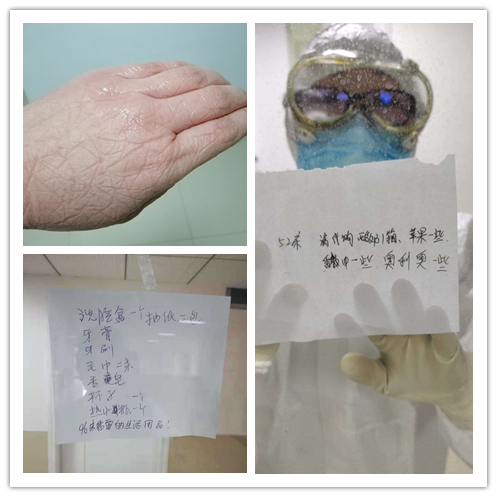 他们负责隔离患者的日常治疗和护理,每天6个小时一次的轮班,穿上隔离服,她们就进入紧张而有序的工作状态。因为穿、脱隔离服有着严格的操作流程和要求,所以不能够喝水,穿着隔离服不方便上厕所。每天她们要做多种检测和病情的记录,身心处于高度戒备状态的同时,还必须时刻密切关注病患的心理变化,安抚病患的情绪。