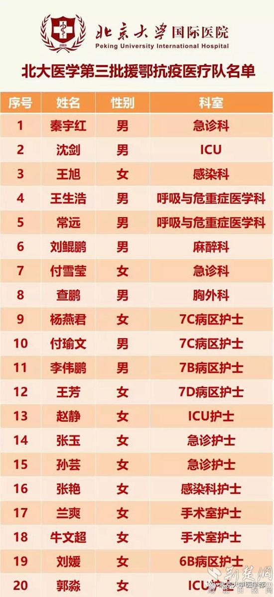 图为:北大医学第三批援鄂抗疫医疗队名单。北大医学部官微