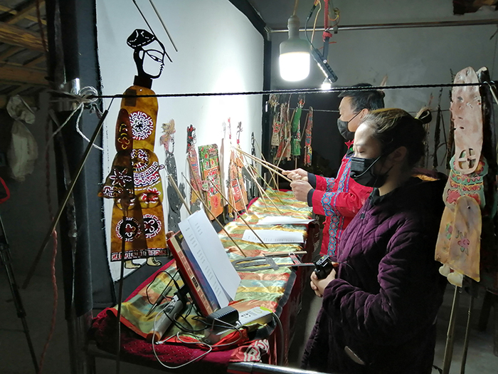 2月4日,恩施市崔家坝镇水田坝村皮影戏传承人郑明汉和家人一起录制皮影戏。