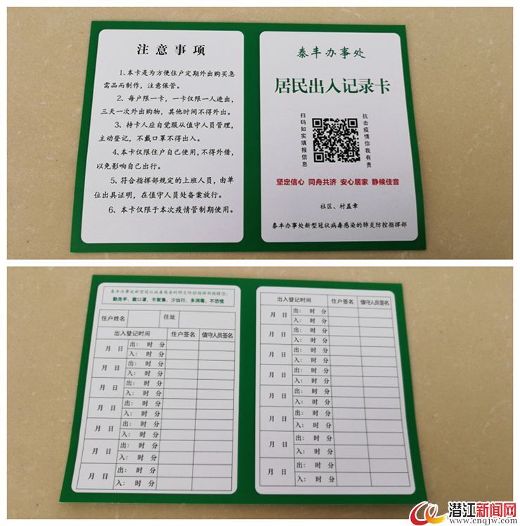 记录卡的正面写着:坚定信心、同舟共济、安心居家、静候佳音。打开后,则可填写住户姓名、住址、出入登记时间等信息。