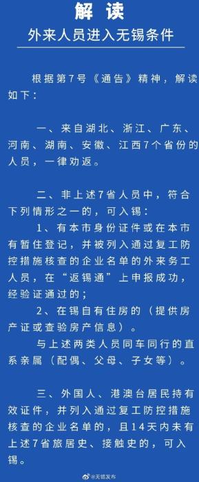 中新网2月9日电 据无锡市人民政府新闻办公室官方微博消息,无锡市政府8日晚发布通告,来自湖北、浙江、广东、河南、湖南、安徽、江西7个省份的人员,一律劝返。