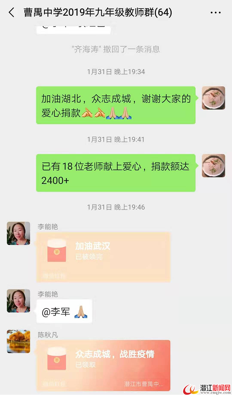 文昌中学教师杨明斌患有严重的耳疾,病休多年,生活艰难。2月1日上午,身在深圳的他看见教师群里的捐款倡议后,立刻给工会主席微信转账100元请代为捐赠。