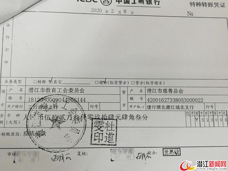 潜江新闻网讯(记者 曹以成)2月8日下午,一笔超过52万元的捐款汇入市慈善总会的专用账户,这是来自潜江市教育系统每一位干部职工的善心之举。该款项将由慈善总会统一进行管理和捐赠,用于我市新冠肺炎疫情防控工作。