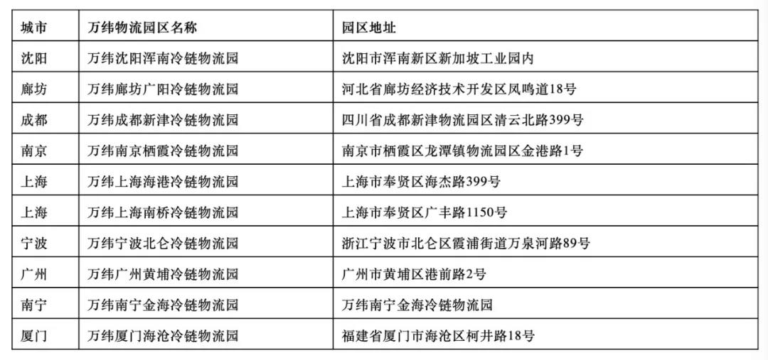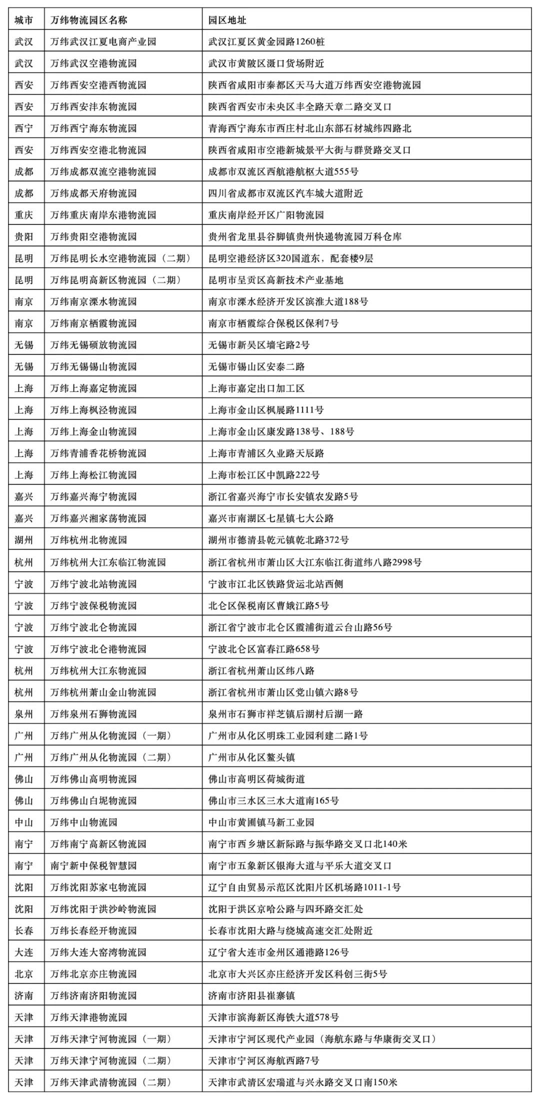 万纬物流为抗疫应急无偿开放的全国物流园清单显示,冷链物流园10个;常温高标仓物流园49个。其中,在疫区武汉万纬物流宣布开放两个区域的大型物流园,分别位于城区的江夏区与黄陂区。
