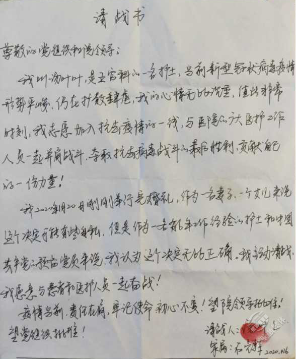刚刚新婚,主动放弃婚假,递交请战书,请求奔赴抗疫前线,贡献自己的一份力。市人民医院预备党员、护士汤叶叶在请战书中这样写道:“疫情当前,责任在肩,牢记使命,初心不变!”