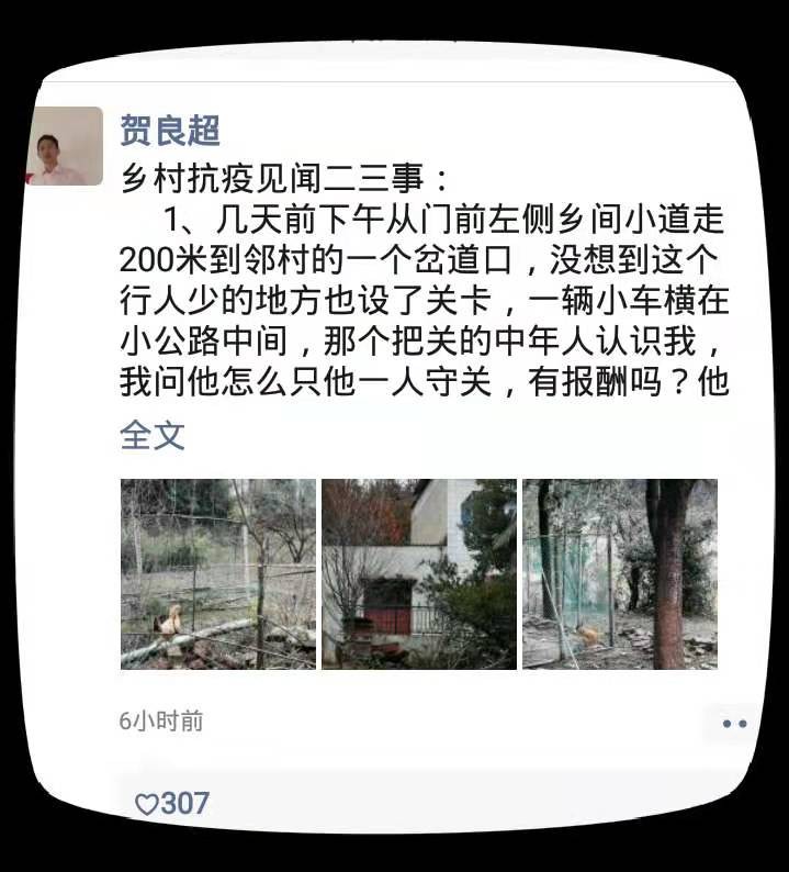 2月11日,赤壁市黄盖湖镇铁山村一位从广州返乡村民贺良超在朋友圈里发了一条长文,写下抗疫期间,他在铁山村的所见所闻,原文如下: