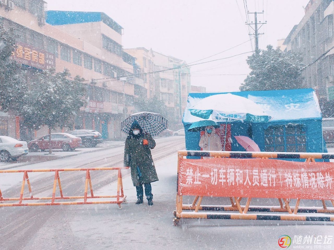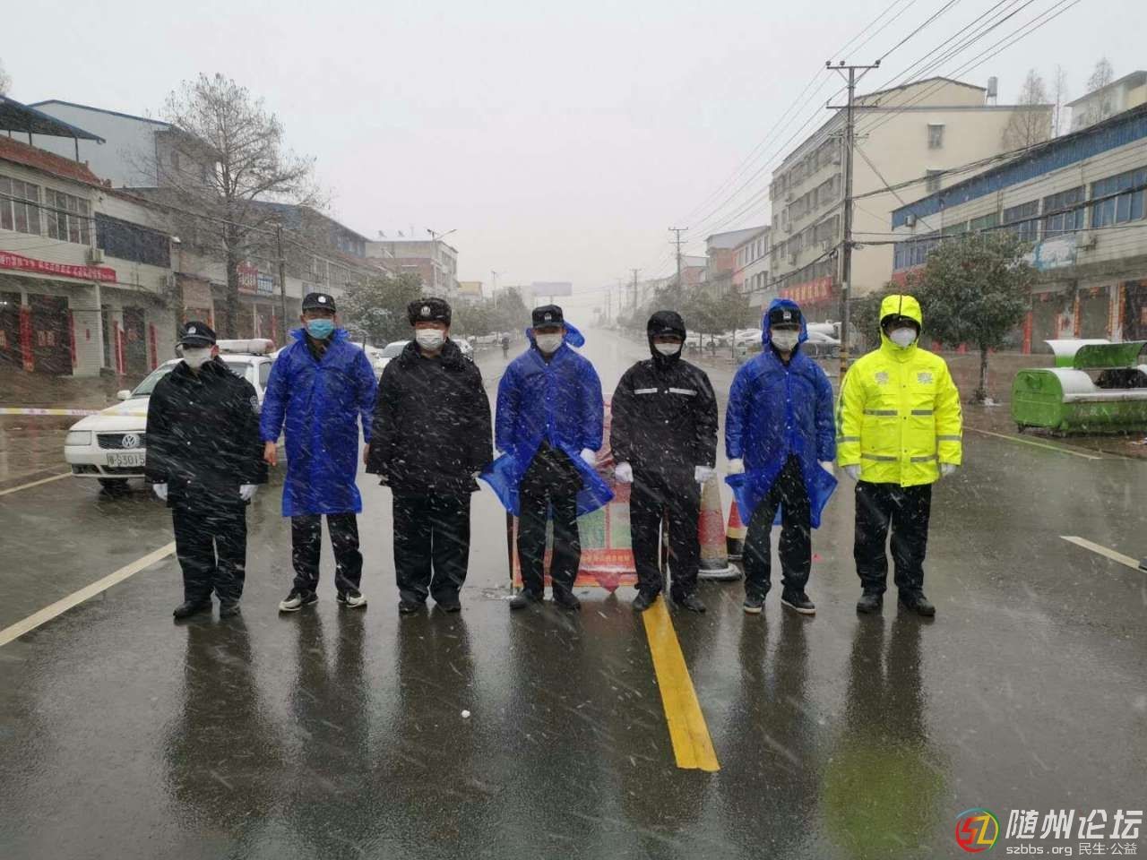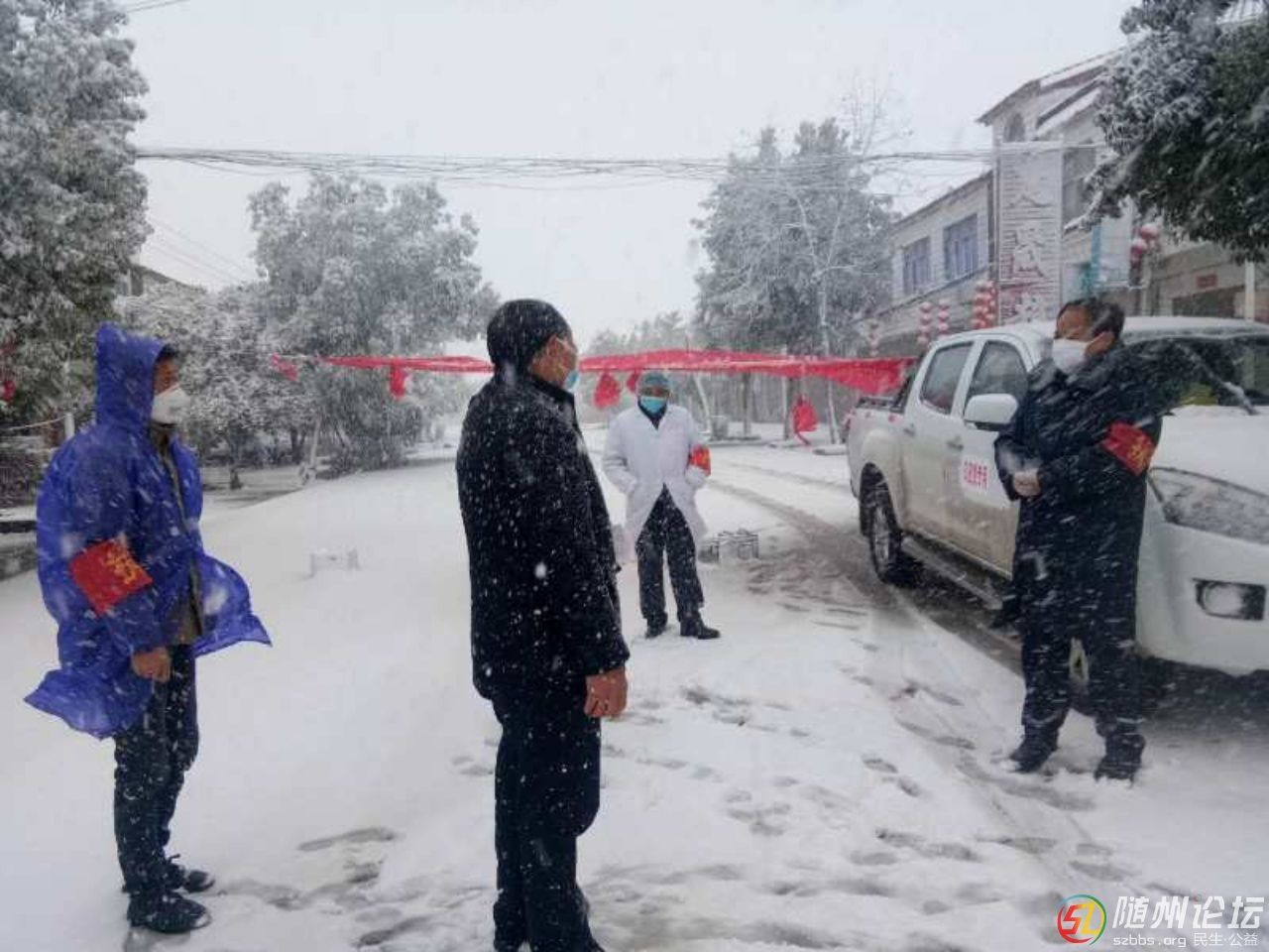 从14日晚开始,随州市普降雨雪。在全市开展疫情防控人民战争、总体战、阻击战的关键时刻,这场雨雪将给疫情防控的物资运输等方面造成一定影响。疫病无情人有情,风雪虽寒人心暖。各地值勤干部、公安民警、志愿者冒着雨雪依然坚守在防控疫情工作一线,在每个街巷村口,用爱心和责任心筑起抗击疫情的钢铁长城。雨雪无阻,众志成城!向坚守在疫情防控一线的所有战士们致敬!2月15日,洪山镇各村(居)党员干部和志愿者们在寒冷的天气中坚守一线,与疫情作斗争。(刘亚男)