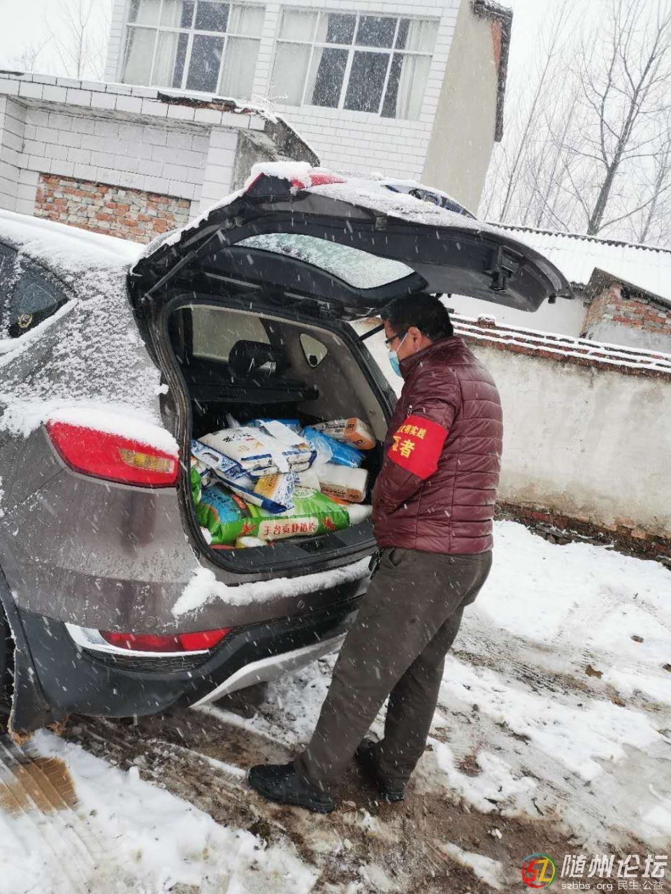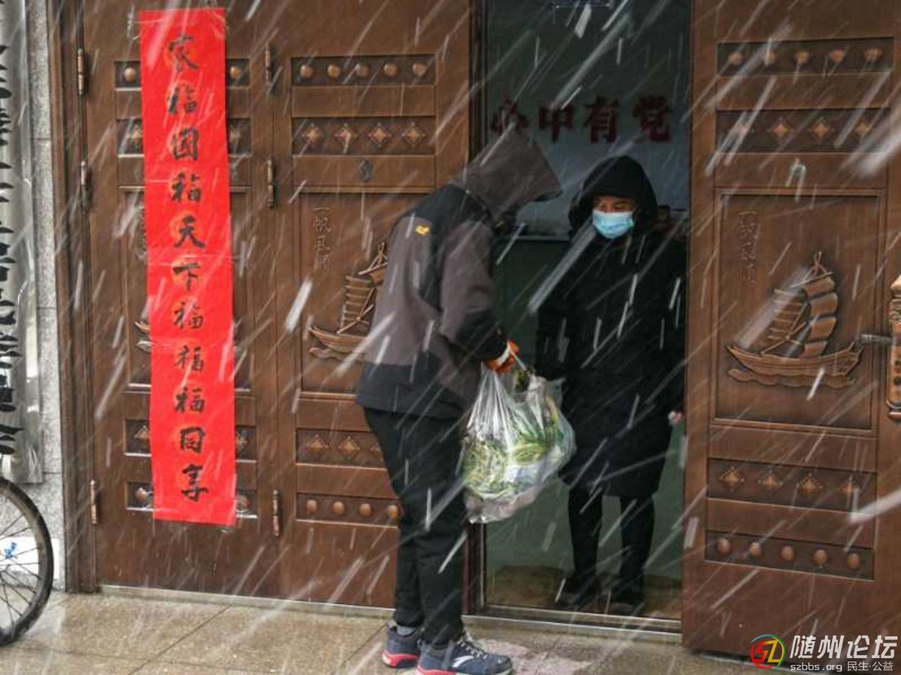 2月15日,曾都区西城办事处汉东楼社区,社区志愿者冒雪为居民群众送蔬菜。