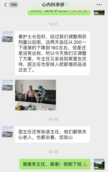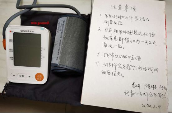 心内科李妍主任和牛晓琳主任去我家看望了我婆婆,进行了调药,赠送了一台自动血压计,还手写了一份大字版的注意事项,贴在家里最显眼的地方,并留下自己的电话号码。李妍主任说:“姜雪护士长不在,我们就是您的家人,有事随时给我们打电话。”