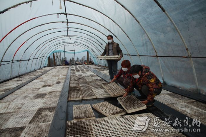 2月14日,巴东县金果坪乡长冲村四组村民颜学平一家人正在烟叶漂浮育苗温棚里劳作。