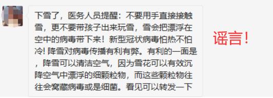 与此同时,“千万别出门玩雪,会感染新冠病毒!”“医务人员提醒你,不要用手直接接触雪,更不要带孩子出去玩雪,雪会把漂浮在空中的病毒带下来!”……