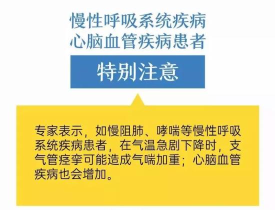 答:面对寒潮天气,普通市民需要加强自身保暖,尤其是有呼吸系统和心血管系统基础疾病的市民,避免因受寒而导致机体免疫力下降,从而更易感病毒;其次仍然要坚持居家隔离少外出。市民要做好保暖,保持营养,增强自身体质和免疫力。