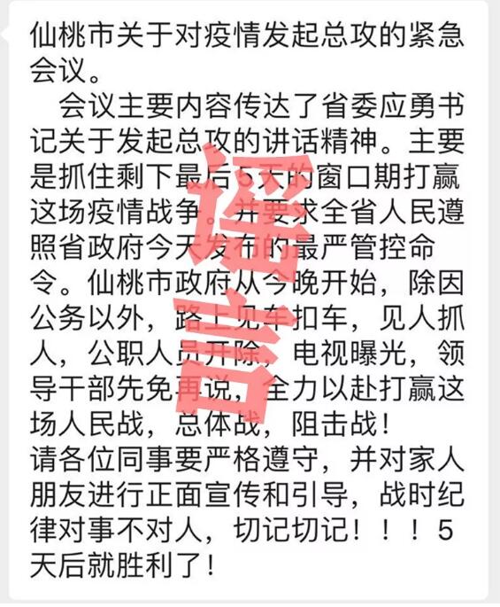 经核实,近日网传“仙桃市关于对疫情发起总攻的紧急会议”相关信息不属实,系谣言。请广大网友从官方权威渠道获取信息,不传谣、不信谣!