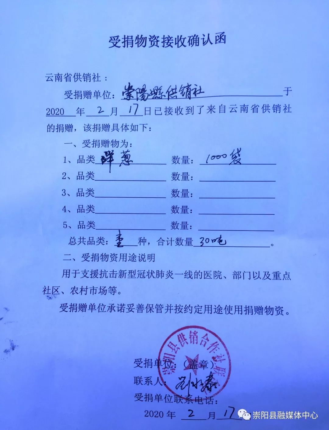 接受捐赠的县供销社主任刘水泰介绍,这批物资是咸宁市供销社协调,由云南省供销社统一调运过来的,累计1000袋洋葱总重达30吨,价值30万元,这批物资将由县防控指挥部作为战略物资统一贮存,分批调配,用于支援抗疫一线的医院、部门以及重点社区、农村市场等。