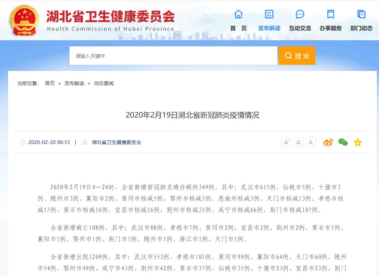 2020年2月19日0—24时,全省新增新冠肺炎确诊病例349例,其中:武汉市615例、仙桃市5例、十堰市3例、随州市3例、襄阳市2例、黄冈市核减5例、鄂州市核减5例、恩施州核减5例、天门市核减13例、孝感市核减15例、黄石市核减16例、宜昌市核减16例、荆州市核减31例、咸宁市核减66例、荆门市核减107例。