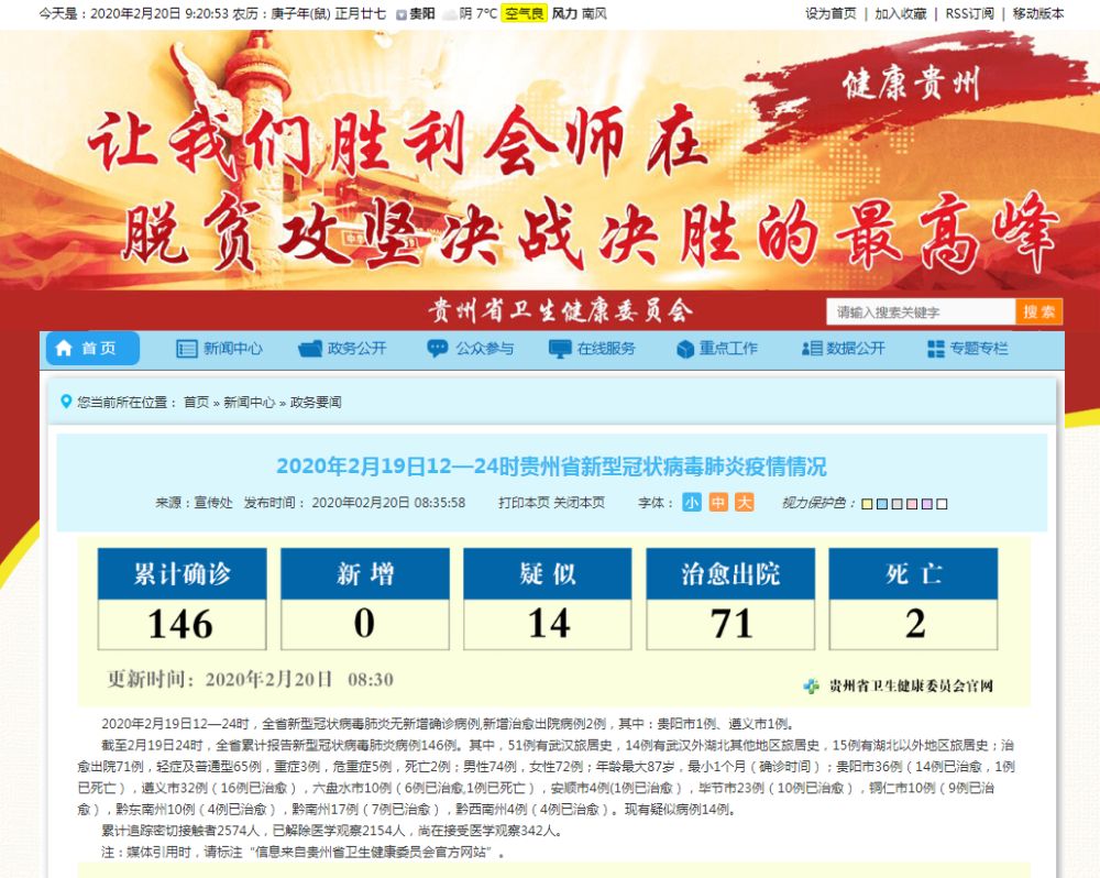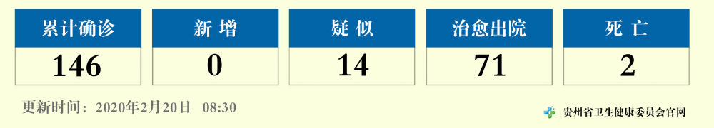 截至2月19日24时,全省累计报告新型冠状病毒肺炎病例146例。其中,51例有武汉旅居史,14例有武汉外湖北其他地区旅居史,15例有湖北以外地区旅居史;治愈出院71例,轻症及普通型65例,重症3例,危重症5例,死亡2例;男性74例,女性72例;年龄最大87岁,最小1个月(确诊时间);贵阳市36例(14例已治愈,1例已死亡),遵义市32例(16例已治愈),六盘水市10例(6例已治愈,1例已死亡),安顺市4例(1例已治愈),毕节市23例(10例已治愈),铜仁市10例(9例已治愈),黔东南州10例(4例已治愈),黔南州17例(7例已治愈),黔西南州4例(4例已治愈)。现有疑似病例14例。
