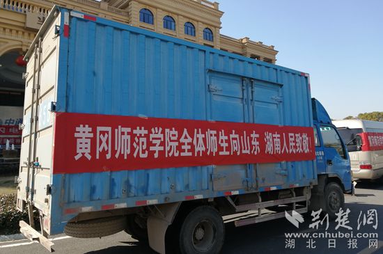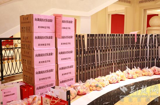 荆楚网客户端-荆楚网消息(通讯员余艳军、刘细松)2月18日上午,两辆载满蕲艾、葛根醋、沃柑等价值约10万元慰问物资的汽车驶进支援黄冈的山东、湖南医疗队驻地。这也是黄冈师范学院再次以实际行动,表达对鲁、湘两地医疗队的敬意。