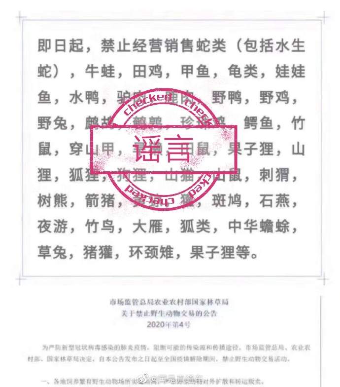 国家市场监管总局、农业农村部、国家林草局三部委日前发布关于禁止野生动物交易的公告,要求全国疫情解除期间,禁止野生动物交易活动。远离“野味。近日,网传一份名单显示,牛蛙、甲鱼、水鸭等也被禁止经营销售。中新社@国是直通车记者向相关部门了解获悉,三部委尚未发布相关禁食名单,也没有见过这一名单。
