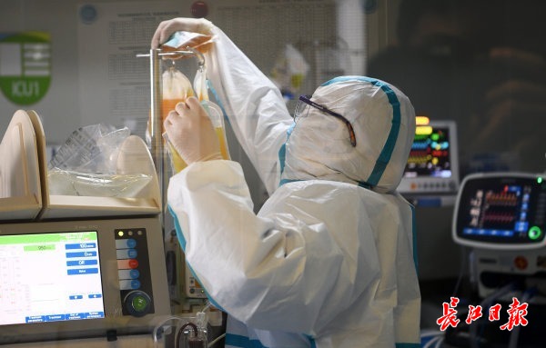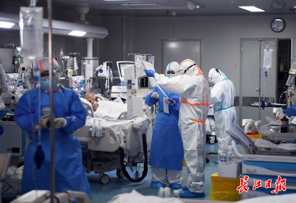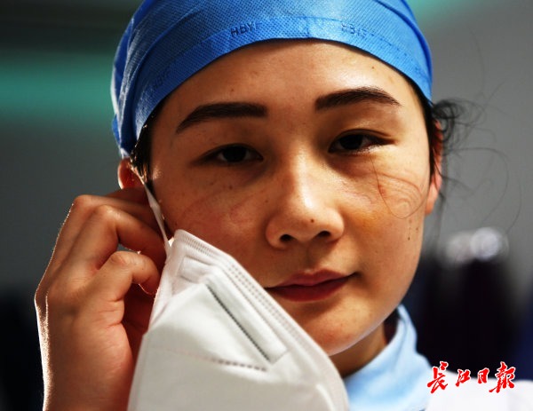 长江网2月21日讯 2月20日,武汉市肺科医院ICU重症监护室,医护人员正全力抢救新冠肺炎重症患者。肺科医院是第一批收治新冠肺炎的定点医院,专门收治危重症病人。ICU重症监护室内,49名医护人员超负荷工作,每天仅能休息2至3个小时,经常到凌晨两三点才能吃上饭,每次脱下防护服,全身被汗水浸透。当她们走出隔离区摘下面罩,一道道勒痕深深地印在她们的面部。她们每天都在和病毒较量,与时间赛跑,与死神抢夺生命,每天都在上演着一场场没有硝烟的战争。(记者金振强 通讯员王敏 巩瑜 摄影报道)