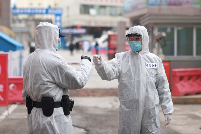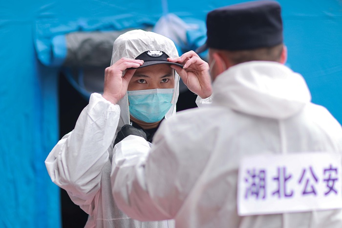 准备在利川市人民医院门口协助开展工作的王飞穿上防护服,与同事相互整理衣着。