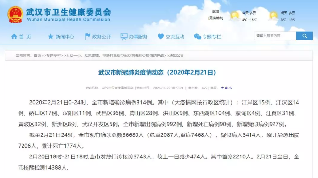 武汉市新冠肺炎疫情动态(2020年2月21日)