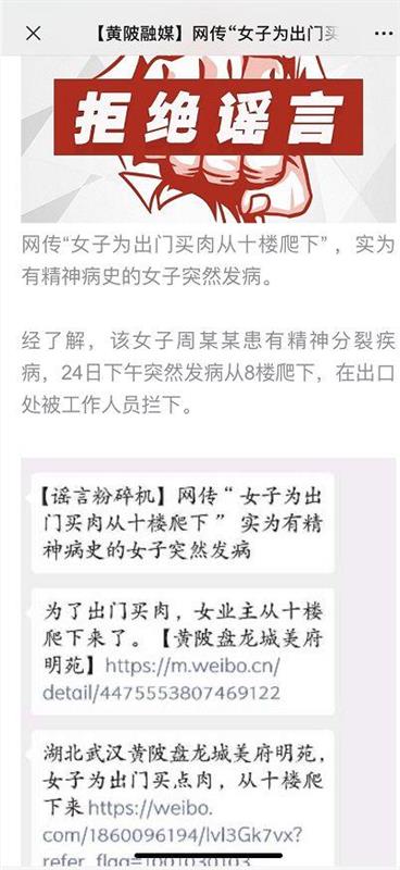 24日晚9时30分,黄陂区宣传部通报称,网传“女子为出门买肉从十楼爬下”,实为有精神病史女子发病,下午突然发病爬下楼,在小区出口被拦。请市民不信谣,不传谣!