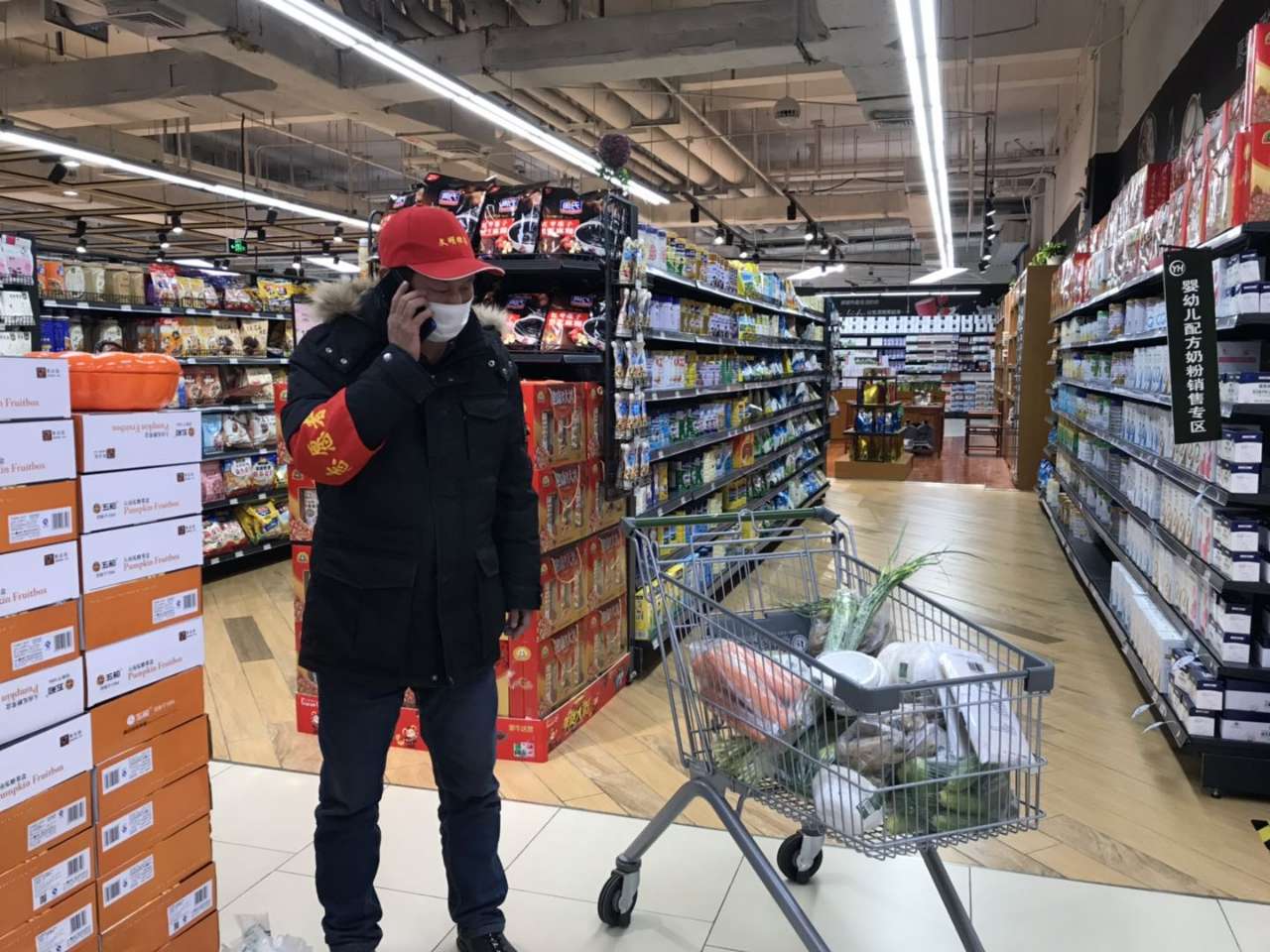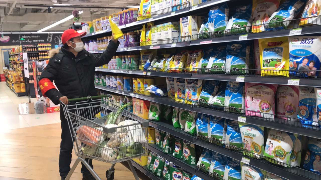 卖场内,各个货架上物品充足,超市员工和代购产品的志愿者分散在超市各处,正在按照居民的订单需求选择物资。
