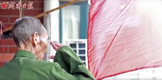 ▲身体好的时候,唐老每天在自家阳台上举行“升旗仪式”