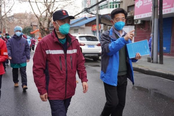 四川省医疗队总领队王东(左)正在跟武汉市武昌医院负责人对接工作。