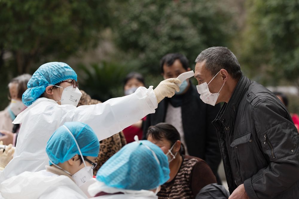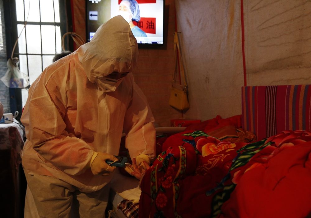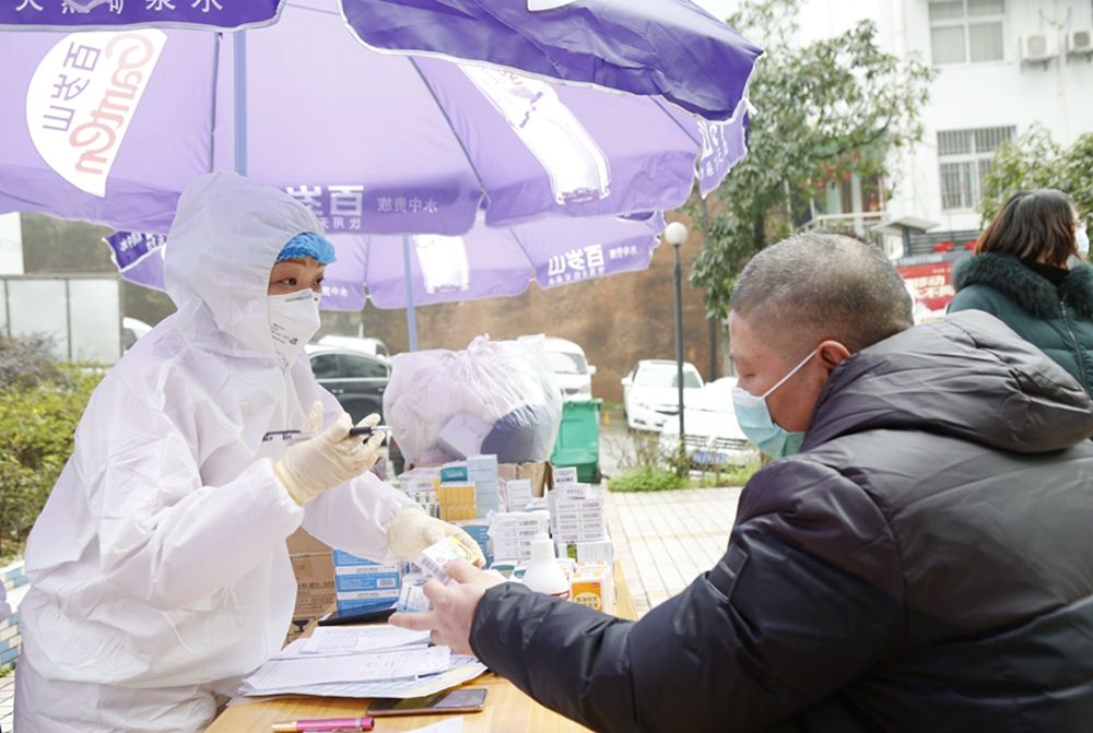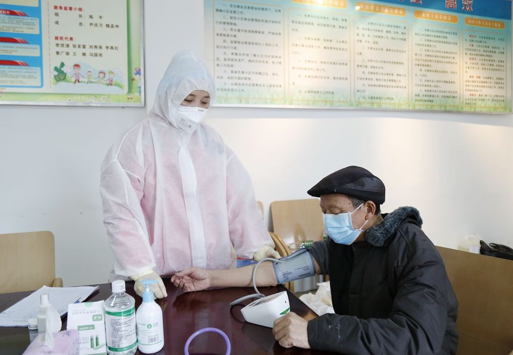 2月26日上午,恩施州城麻纺厂住宿小区,恩施市中心医院巡回医疗队成员正在为群众测量血压。